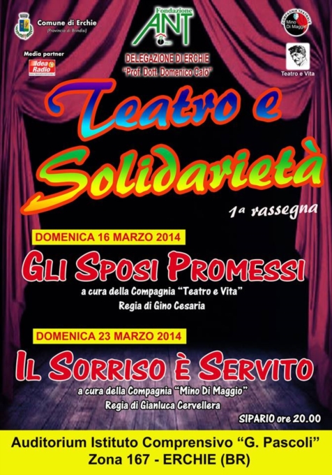 La delegazione ANT di Erchie “Prof. Dott. Domenico Calò” è pronta per un nuovo appuntamento con la solidarietà. I volontari ercolani hanno, infatti, organizzato due serate teatrali di beneficenza, a sostegno degli ammalati oncologici, previste per domenica 16 e 23 marzo, presso l’Auditorium dell’Istituto Comprensivo “G. Pascoli”, zona 167 di Erchie. In scena si alterneranno due esilaranti spettacoli a cura delle compagnie Teatrali Torresi “Teatro e Vita” e “Mino di Maggio”. Domenica 16 marzo andrà in scena RENZO E LUCIA SPOSI PROMESSI commedia in due atti di Gino Cesaria e con la regia dello stesso, che rifà un po' il verso, senza volerle profanare, alle "parodie" musicali del Quartetto Cetra: siparietti costruiti con canzoni note, balletti e gag. Niente di presuntuoso, ma solo il proposito di far passare allo spettatore un momento, teatrale, divertente e gradevole.