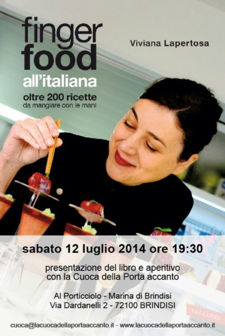 Sarà presentato sabato prossimo 12 luglio, nella splendida location del Porticciolo di Brindisi, l'ultimo libro di ricette di Viviana Lapertosa, "Finger Food all'italiana" edito da Vallardi. L'appuntamento è alle 19.30: sarà l'occasione per conoscere e incontrare l'autrice, acquistare il libro (in collaborazione con la libreria Feltrinelli) e assaggiare alcuni degli oltre 200 finger food proposti nel volume, in abbinamento a bollicine pugliesi.Viviana Lapertosa, brindisina, vive in Lombardia da diversi anni. Laureata in Storia del Cinema all'Università di Bologna, con una tesi su "Cinema e cibo", diventata poi un libro (edito da Lindau, "Dalla fame all'abbondanza. Gli italiani e il cibo nel cinema italiano dal dopoguerra a oggi"). Tra la passione del cinema e il cibo, ha prevalso quest'ultimo, iscrivendosi al primo Master in Comunicazione e Giornalismo Enogastronomico del Gambero Rosso. Nella sua bibliografia troviamo altri tre libri: "Finger Food, 120 ricette da mangiare in un boccone", "Tuttifritti" con alcune ricette pugliesi e della tradizione brindisina, "Finger Food 140 ricette da mangiare in un boccone". Tra un libro e l'altro, i fornelli hanno il sopravvento e si iscrive a un corso professionale di cuoco curato dal Gambero Rosso. Di lei scrive sul suo blog e sito internet www.lacuocadellaportaccanto.com che "con un diploma di cuoco e la certezza di essere "cuoca e basta, cuoca per sempre" ho iniziato a cucinare a domicilio, a organizzare feste, buffet e corsi di cucina. E soprattutto a scrivere le mie ricette fotografate dal bravissimo Luca Bartolomei". Tra le altre esperienze, anche le trasmissioni televisive su RSI 1, la televisione della Svizzera Italiana, su Alice (canale di cucina sul digitale terrestre) e su Gambero Rosso Channel.
