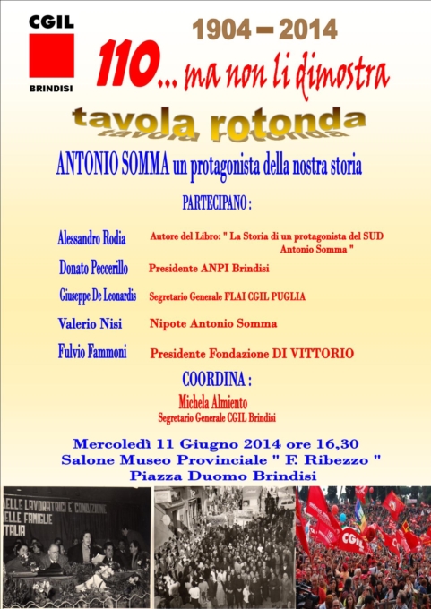 "La storia di un protagonista del sud. Antonio Somma", libro-intervista a cura di Alessandro Rodia sulla vita politica di Antonio Somma, dai primi passi come partigiano a quelli dell'impegno sindacale e politico nella CGIL e nel PCI. Sarà presentato presso il Museo Provinciale "E. Ribezzo" di Brindisi in Piazza Duomo, mercoledì 11 giugno, alle ore 16,30.Antonio Somma nasce a Spiano di Mercato San Severino (SA), il 19 novembre 1923.