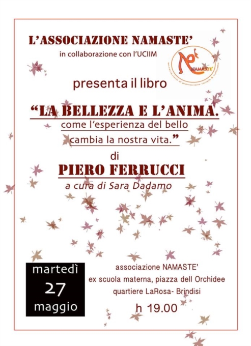 L'associazione Namastè in collaborazione con l'UCIIM (unione cattolica italiana di insegnanti, dirigenti, educatori e formatori del sistema educativo di istruzione e di formazione italiano) presenta martedì 27 maggio ore 19,00 il saggio"La bellezza e l'anima. Come l'esperienza del bello cambia la nostra vita" di Piero Ferrucci, edito Mondadori.
