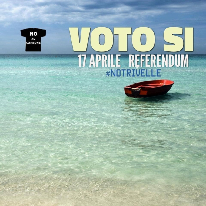 Invitiamo a votare SI contro l'energia fossile, contro le lobby, contro l'inutile sfruttamento delle risorse, per un futuro sostenibile. Un SI convinto anche alla luce delle ultime vicende di corruzione emerse nella vicina Basilicata che hanno messo in evidenza tutti i danni causati dalle trivellazioni dopo anni di sfruttamento di una bellissima terra, con gravi conseguenze sull'economia e sulla salute dei cittadini.