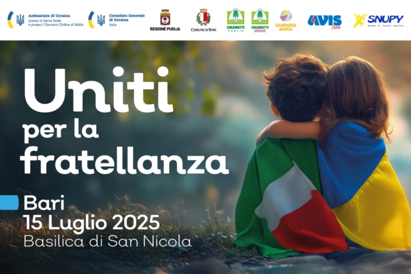 Saranno i bambini i protagonisti dell'evento: "Uniti per la Fratellanza", in programma il prossimo 15 luglio a partire dalle ore 10 sul sagrato della Basilica di San Nicola. Una vera e propria festa per unire simbolicamente la città di Bari e l'Ucraina.Promotori dell'iniziativa: l'Ambasciata d'Ucraina presso la Santa Sede e presso il Sovrano Militare Ordine di Malta e il Consolato Generale dell'Ucraina in Italia e del delegato Alessandro De Biase.