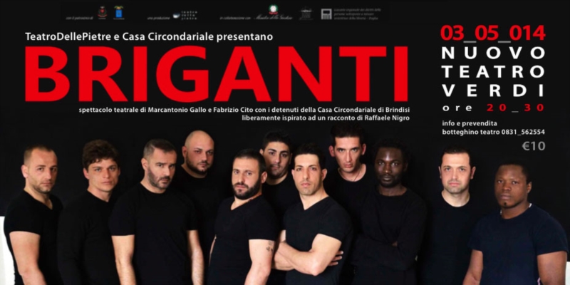 Il TeatroDellePietre e la Casa Circondariale di Brindisi hanno il piacere di presentare la nuova produzione teatrale BRIGANTI, di Marcantonio Gallo e Fabrizio Cito, liberamente ispirato ad un racconto di Raffaele Nigro, che andrà in scena il 3 maggio 2014 al Nuovo Teatro Verdi alle ore 20.30. Da due anni il TeatroDellePietre ha avviato il progetto DENTRO/FUORI: carcere e dintorni, un laboratorio teatrale e di scrittura creativa legato al tema della legalità e dell’opportunità di recupero, rivolto ai detenuti della Casa Circondariale di Brindisi.