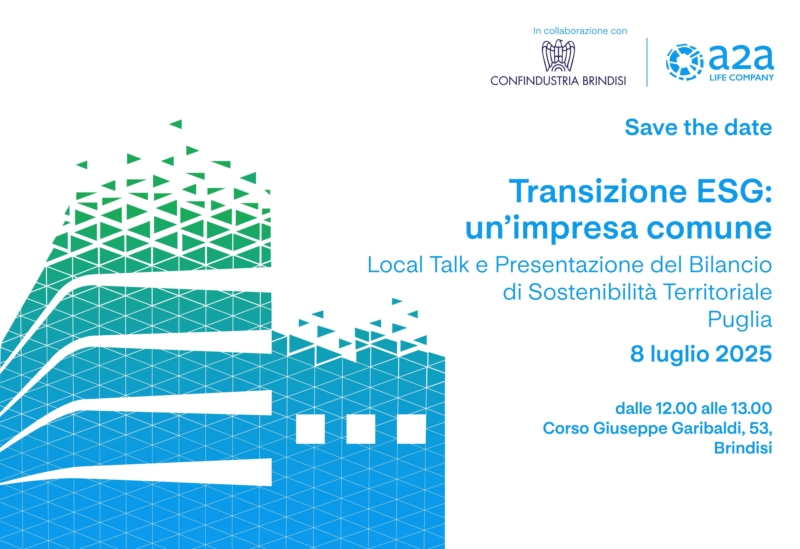 Domani, martedì 8 luglio alle ore 12:00, si terrà l'evento annuale di presentazione del Bilancio di Sostenibilità Territoriale della Puglia presso Confindustria Brindisi, Corso Giuseppe Garibaldi 53, Brindisi.Durante l'incontro Lorenzo Spadoni, Direttore della BU Generazione & Trading di A2A, presenterà il Bilancio di Sostenibilità Territoriale del Gruppo e discuterà delle prospettive della transizione sostenibile insieme a Giuseppe Marchionna, Sindaco di Brindisi e Alessandro Monticelli, CEO, CTO e fondatore di Green Independence.