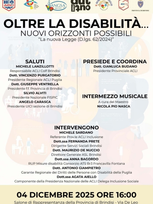 Le Acli di Brindisi, nell’ambito delle attività di promozione sociale rivolte al cittadino e per favorire il dialogo interistituzionali tra corpi intermedi, politica e rappresentanti delle istituzioni, promuovono per Givedì 4 DICEMBRE p.v. alle ore 16, un evento di grande rilievo sociale e politico sul tema: “Oltre la disabilità, nuovi orizzonti possibili”. Un confronto istituzionale con i protagonisti del Terzo Settore ma anche della politica e della sanità sul Decreto legge 62/2024, che è entrato in vigore il 30 giugno dello scorso anno. Con un focus significativo e di cambiamento perché si passa da un modello biomedico a un approccio biopsicosociale, che mette al centro la persona. E’ una riforma che definisce la condizione di disabilità, introduce un nuovo sistema di valutazione di base e ridefinisce i concetti di "accomodamento ragionevole" e "progetto di vita". Sostituisce i termini "handicap" e "portatore di handicap" con "persona con disabilità", secondo i principi della Convenzione ONU. Si ottimizzano anche gli iter burocratici sul riconoscimento dello status di persona con disabilità: la valutazione dell'invalidità diventa competenza totale dell'INPS e il processo valutativo è semplificato tramite un'unica visita collegiale. Si incoraggia l'uso del Fascicolo Sanitario Elettronico, che dovrà contenere anche il certificato di disabilità.