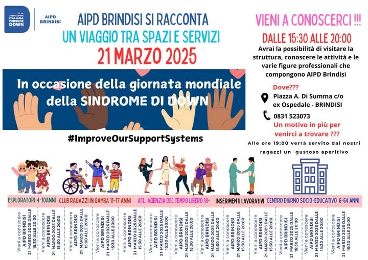 AIPD Brindisi apre le porte alla cittadinanza per un’esperienza multisensoriale assolutamente unica ed entusiasmante. L’iniziativa, in programma venerdì 21 marzo pv (dalle 15,30 alle 20,00) a Brindisi in Piazza A. Di Summa, presso l’ex ospedale, nasce dalla volontà dell’Associazione Italiana Persone Down di diffondere la metodologia AIPD su tutto il territorio, forte e consapevole dei risultati raggiunti negli ultimi anni con più di 40 famiglie nella zona di Brindisi e Provincia.Come è noto AIPD Brindisi gestisce un Centro Diurno, situato presso l’ex Ospedale Di summa ed accreditato dalla Regione Puglia ai sensi del R.R. 5/19, inoltre accoglie diversi gruppi pomeridiani destinati allo sviluppo, potenziamento, mantenimento e recupero delle abilità di autonomia delle persone con la Sindrome di Down. L’Associazione ha altresì deliberato la volontà di aprire il proprio operato anche a nuove famiglie su tutto il territorio provinciale grazie anche all’ottenimento, con il contributo di Ferrovie dello Stato, di una nuova sede nella città di Mesagne.