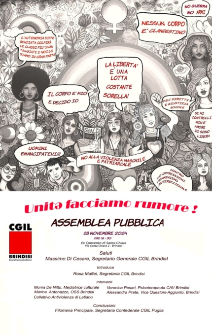 In occasione della Giornata mondiale contro la violenza sulle donne, il 28 novembre alle ore 16:30, presso l'ex Convento di Santa Chiara a Brindisi, il Coordinamento Donne della Cgil Brindisi organizza l’assemblea pubblica «Facciamo rumore».