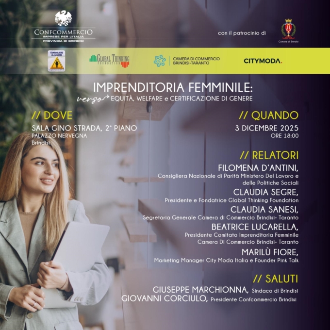 Confcommercio Brindisi, con il patrocinio del Comune di Brindisi, ha organizzato un convegno sul tema "Imprenditoria femminile: verso equità, welfare e certificazione di genere" che si terrà nella Sala Gino Strada di Palazzo Nervegna mercoledì 3 dicembre, alle ore 18.00.L'iniziativa è stata promossa con la Fondazione "Global Thinking", con la Consigliera nazionale di parità ed in collaborazione con la Camera di Commercio Brindisi/Taranto.