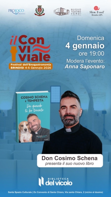 Domenica 4 gennaio 2026, ore 19:00 – Biblioteca del Vicolo (Ex Convento di Santa Chiara). Modera Anna Saponaro.Brindisi si prepara ad accogliere uno degli appuntamenti più attesi del Festival dell'Enogastronomia "Il Conviviale" (4–5 gennaio 2026): domenica 4 gennaio alle ore 19:00, presso la Biblioteca del Vicolo – Santa Spazio Culturale, Ex Convento di Santa Chiara (Via Santa Chiara, 2 – zona Duomo), Don Cosimo Schena sarà protagonista di un incontro speciale per presentare il suo nuovo libro "Da quando ti ho trovato" (Piemme), scritto insieme a Tempesta, la sua amata cagnolina.
