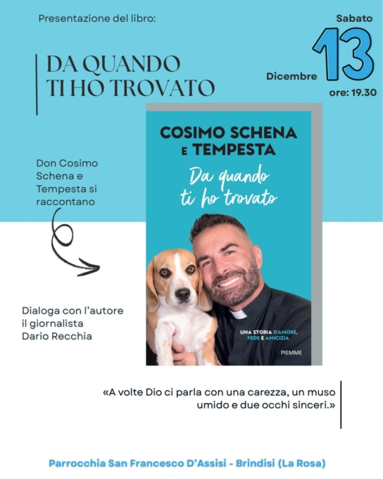 Sabato 13 dicembre, alle ore 19.30, all'interno della Prima Edizione dell'evento "ALLA ROSA... c'è piaceri", si terrà la presentazione del libro "Da quando ti ho trovato".Per l'occasione il giornalista Dario Recchia dialogherà con l'autore don Cosimo Schena, il prete più seguito sulle piattaforme social, con oltre 1.200.000 follower. Laureato in Filosofia e in Psicologia clinica dinamica, don Cosimo è autore di numerosi libri di poesie e saggi di filosofia e ogni giorno condivide con i suoi lettori riflessioni, rubriche e inviti all'amore, alla pace e alla cura del creato.