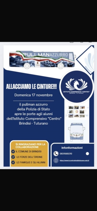 Polizia di Stato: domenica 17 novembre il Pullman Azzurro farà tappa a Brindisi per la settimana nazionale delle vittime della strada.Per la prima volta a Brindisi, domenica 17 novembre, dalle ore 8 alle 14, lungo Corso Umberto (tratto tra piazza Vittoria e piazza Cairoli), ci sarà il "Pullman Azzurro" della Polizia Stradale. L'evento è stato organizzato dall'Istituto Comprensivo Centro Brindisi-Tuturano, in collaborazione con l'Associazione Italiana Familiari e Vittime della Strada A.P.S. di Carovigno (presieduta da Pasquale Lanzillotti) e la Polizia di Stato.