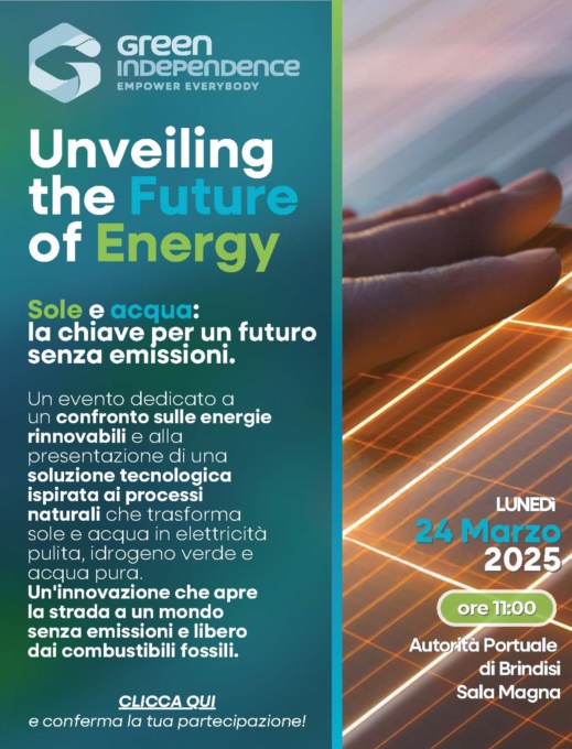 “Unveiling the Future of Energy” il primo evento di Green Independence, start up pugliese impegnata nello sviluppo di tecnologie innovative per accelerare l’indipendenza energetica dai combustibili fossil si terrà a Brindisi il 24 marzo 2025, presso la Sala Magna dell’Autorità Portuale.L’evento sarà l’occasione per presentare in anteprima la loro tecnologia innovativa capace di trasformare sole e acqua in elettricità pulita, idrogeno verde e acqua pura, condividere i progressi e creare nuove opportunità di collaborazione nel settore delle energie rinnovabili e della sostenibilità.