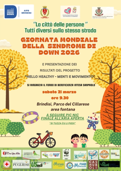 In occasione della Giornata Mondiale della persona con la Sindrome di Down, sabato 21 marzo 2026, l’AIPD di Brindisi promuove un momento d’incontro, "LA CITTÀ DELLE PERSONE". Un evento che nasce con l'obiettivo di superare i recinti dell’assistenzialismo per costruire una rete solida tra tutte le realtà che vivono ed animano la città.L'iniziativa, promossa dai ragazzi, dagli operatori e dalle famiglie dell’associazione, punta a coinvolgere non solo il mondo della disabilità, ma tutte le voci spesso lasciate ai margini o che lottano per una qualità della vita superiore: dai movimenti per la ciclabilità e l’ambiente, alle associazioni che si occupano di bambini e anziani, fino ai comitati per il decoro urbano. "Vogliamo dimostrare che la fragilità non è un peso, ma il parametro su cui misurare la civiltà di una comunità", spiegano gli organizzatori. "Se una strada è sicura per un bambino o accessibile per una persona in carrozzina, è una strada migliore per ogni cittadino. Il 21 marzo vogliamo guardarci in faccia e iniziare a progettare insieme questa città ideale".