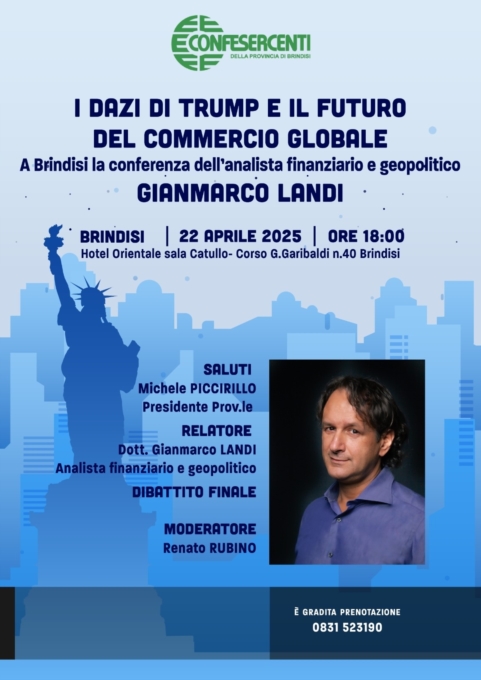 Convegno di Confesercenti.I dazi imposti dagli Stati Uniti, pur se al momento parzialmente procrastinati, rappresentano uno dei temi più dibattuti nell’attuale scenario economico e geopolitico internazionale. In un contesto di forti tensioni commerciali e di ridefinizione degli equilibri globali, Confesercenti Brindisi promuove per martedì 22 aprile2025, presso l’Hotel Orientale di Brindisi, con inizio alle ore 18.00, un incontro di grande attualità dal titolo “I dazi di Trump e il futuro del commercio globale: a Brindisi la conferenza dell’analista Gianmarco Landi”.