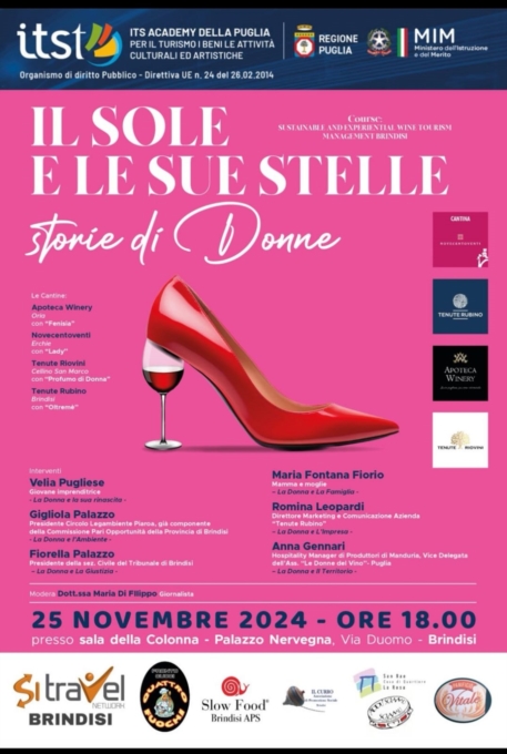 nella sala Sala della Colonna, piano terra, Palazzo Nervegna, via Duomo, Brindisi.In occasione della Giornata Internazionale Contro la Violenza sulle Donne, l’ITS Academy della Puglia per il Turismo i Beni le Attività Culturali ed Artistiche, su idea di Rosa Indirli, studentessa del percorso “Sustainable and Experiential Wine Tourism Management” di Brindisi, propone un evento dedicato a valorizzare il ruolo centrale delle donne nella società, spesso non adeguatamente riconosciuto.