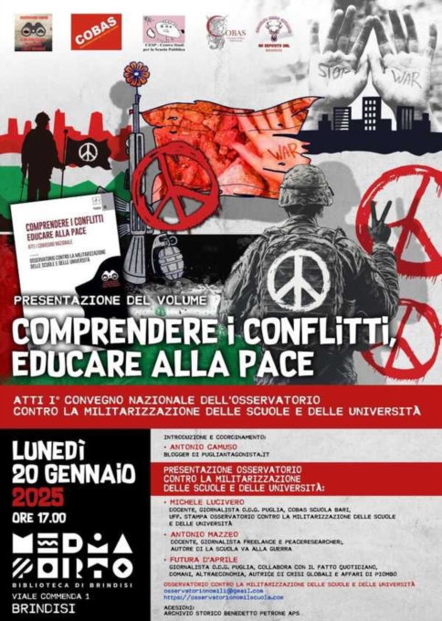 “L’osservatorio nazionale contro la militarizzazione delle scuole e delle università” insieme ad alcune associazioni hanno realizzato nella serata di lunedì 20 gennaio nella sede di Mediaporto a Brindisi un interessante incontro alla presenza di un folto pubblico. I relatori hanno parlato di come i governi che si sono succeduti negli ultimi anni hanno sostenuto con sempre maggiore vigore l’ingresso delle Forze Armate nelle scuole con avvenimenti come quello tenutosi alla caserma Carlotto di Brindisi qualche tempo fa, veramente deplorevole. Siamo coinvolti come città nel regime di guerra, sia attraverso la propaganda bellica rivolta al sistema educativo, sia attraverso l' addestramento delle forze da sbarco ucraine da parte del Battaglione San Marco di Brindisi, come riporta l' articolo che alleghiamo, a firma di Antonio Mazzeo, insegnante, peace-researcher e relatore dell’incontro. Si è parlato di come le Forze Armate hanno il compito di avvicinare le nuove generazioni alla cultura della guerra e allo stesso tempo di prospettare l' arruolamento come possibilità di lavoro, soprattutto al Sud, anche in vista del ripristino della leva obbligatoria. La prospettiva è quella di ricostruire un esercito di massa per compensare l'insufficienza della guerra tecnologica, cosi come sostengono i generali della Nato. I relatori dell'incontro hanno affermato che la Puglia, e con essa la citta di Brindisi, ricopre una parte fondamentale nei programmi di guerra che guardano ad Est fino ad includere la Cina. L’arrivo a Brindisi della nuova portaerei “Trieste" ne è un evidente segnale, unitamente alla presenza delle altre basi e delle fabbriche del complesso militare industriale. L’impegno preso alla fine della serata è quello di coinvolgere le scuole in iniziative di pace, che si contrappongono alla cultura della guerra e al sistema di potere che ne viola impunemente il suo ripudio, come previsto dall'articolo 11 della Costituzione.Roberto Aprile per gli organizzatori della serata