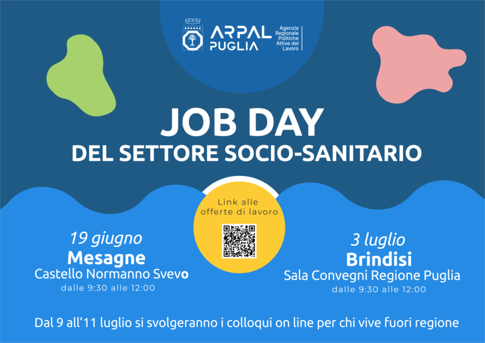 Nell’ambito delle attività del Servizio Incrocio domanda-offerta, intercettando uno specifico fabbisogno del territorio, i centri per l’impiego degli Ambiti di Brindisi di Arpal Puglia stanno organizzando un job day dedicato ai settori sanitario, socio-sanitario, sociale e socio-pedagogico, che si svolgerà in doppia data, il 19 giugno a Mesagne e il 3 luglio a Brindisi.Arpal Puglia ha lanciato la chiamata pubblica agli imprenditori alla ricerca di personale nei settori interessati e numerose sono state le aziende che hanno risposto con estremo interesse.