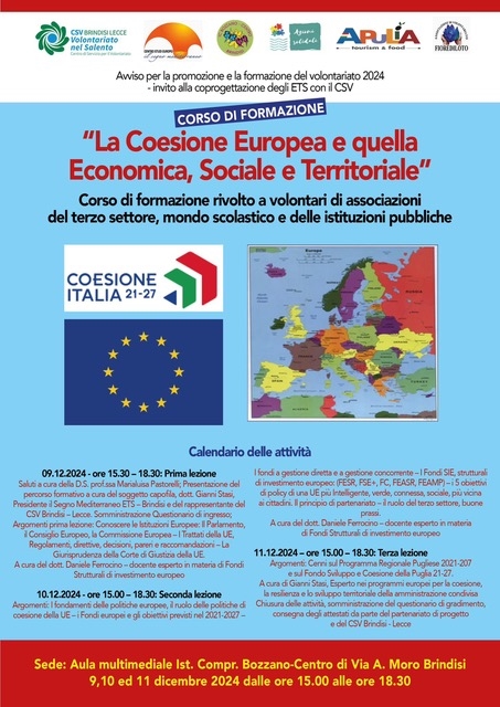 L’argomento è oggetto del programma formativo proposto ed approvato nell’avviso per la promozione e la formazione del volontariato 2024 – invito alla coprogettazione degli ETS con il CSV. Un percorso formativo, rivolto a volontari di associazioni del terzo settore, mondo scolastico e delle istituzioni pubbliche preposte alla conoscenza ed alla opportunità offerta dalla politica della coesione grazie alle straordinarie risorse finanziarie a disposizione nei cicli di programmazione quale quello in corso, 2021-2027.