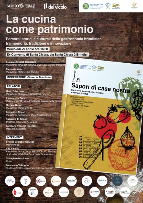 Si terrà mercoledì 29 aprile 2026, dalle 16.30 alle 19.00, presso l’ex convento Santa Chiara di Brindisi, il convegno “La cucina come patrimonio. Percorsi storici e culturali della gastronomia brindisina tra memoria, tradizione e innovazione”, organizzato dall’Inner Wheel Club di Brindisi Cristina Cordella e dal Rotary Club Brindisi. L’iniziativa metterà al centro il valore della cucina come espressione di identità, memoria collettiva e patrimonio culturale del territorio.A guidare i lavori sarà un moderatore d’eccezione, il giornalista e studioso di storia locale Giovanni Membola, la cui presenza impreziosisce ulteriormente il valore culturale dell’iniziativa.