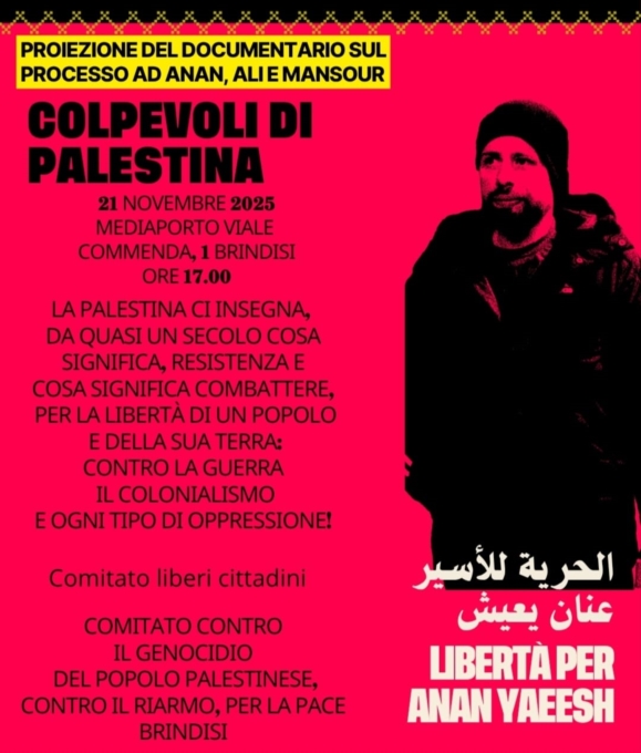 In occasione della giornata di mobilitazione nazionale dell'Aquila in concomitanza con la convocazione all’udienza dell’ambasciatore dello Stato terrorista d'Israele,Il Comitato liberi cittadini, il Comitato contro il genocidio del popolo palestinese, contro il riarmo, per la pace di Brindisi in collaborazione con il Polo biblico museale di Brindisi promuovono la proiezione del documentario “Colpevoli di Palestina”, venerdì 21 novembre 2025 alle ore 17 presso il Mediaporto Viale Commenda, 1 Brindisi. Discuteremo della “’Campagna di solidarietà per Anan, di quanto accade in Palestina e della storia di Anan Yaeesh, cittadino palestinese recluso nel carcere di alta sicurezza di Melfi”.