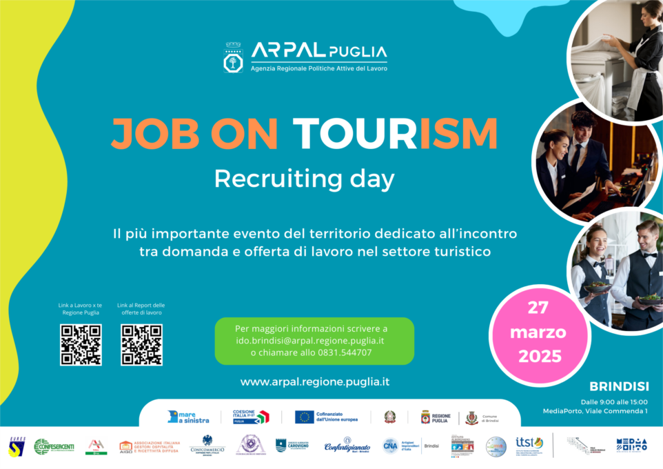 DOMANI, Giovedì 27 marzo dalle 9:00 alle 15:00 presso gli spazi del MediaPorto di Brindisi in viale Commneda 1, si svolgerà la seconda edizione di “Job On Tour...ism”, il recruiting day ideato da ARPAL Puglia - ambito territoriale di Brindisi dedicato al settore Ho.Re.Ca., con particolare riferimento ai settori del Food and Beverage, del Front Office, dell’Animazione turistica e dell’Housekeeping.L’evento vede la partecipazione delle più importanti aziende e sigle di settore, tra cui Confcommercio, Federalberghi, Confesercenti, Assohotel, AIGO, CNA, Confartigianato, Consorzio degli Albergatori di Carovigno nonchè ITS Turismo, Istituto Alberghiero Pertini, Liceo Ettore Palumbo.
