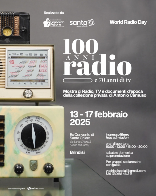 A Brindisi la mostra "100 Anni di Radio e 70 Anni di TV" per celebrare il World Radio DayIn occasione del World Radio Day, dal 13 al 17 febbraio 2025, l'Ex Convento di Santa Chiara di Brindisi (via santa Chiara, 2) ospiterà la mostra "100 Anni di Radio e 70 Anni di TV", un evento unico che ripercorre la storia della comunicazione attraverso un'ampia collezione di radio, televisori e documenti d'epoca.