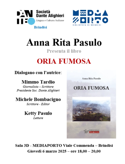 Presentazione del libro Oria fumosa di Anna Rita Pasulogiovedì 6 marzo ore 18.00 presso la Sala 3D del MediaPorto - Biblioteca di Brindisi, Viale Commenda 1