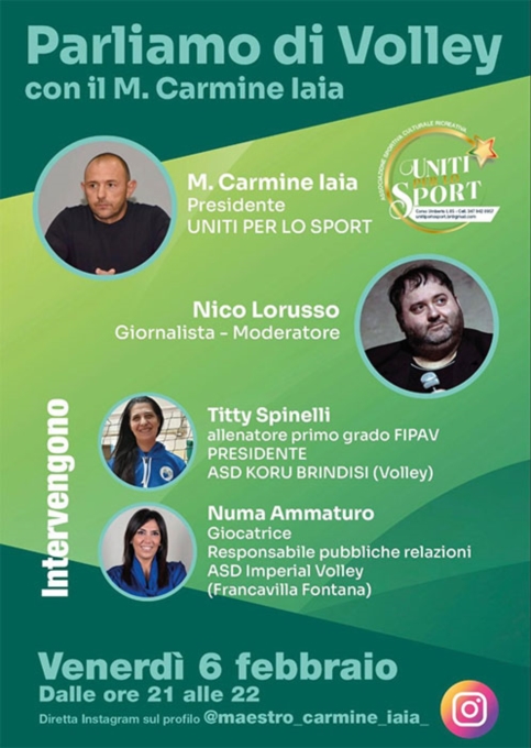 Il format social "Parliamo di Sport con il Maestro Carmine Iaia" continua a crescere, confermandosi un punto di riferimento per il racconto autentico dello sport locale. Dopo una terza puntata partecipata, apprezzata e ricca di spunti di riflessione, capace di coinvolgere non solo le associazioni aderenti al sodalizio Uniti per lo Sport ma anche numerose altre realtà sportive cittadine, il progetto torna con un nuovo appuntamento dedicato a una disciplina storica e fortemente radicata nel territorio: la pallavolo.La quarta puntata andrà in onda venerdì 6 febbraio, alle ore 21.00, sempre in diretta sulla pagina Instagram @maestro_carmine_iaia. Restano confermati alla conduzione il Maestro Carmine Iaia, Presidente della ASCR Uniti per lo Sport, e il giornalista Nico Lorusso, che guideranno il confronto mantenendo lo stile diretto e partecipativo che caratterizza il format.