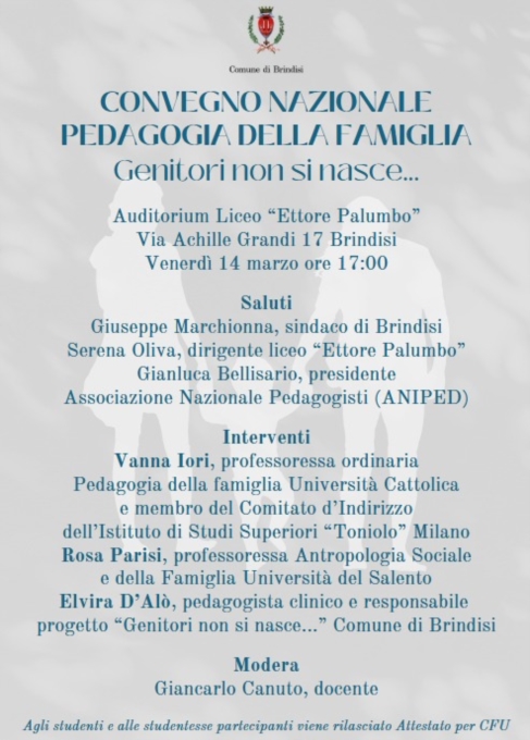 Si terrà Venerdì 14 Marzo p.v. il Convegno Nazionale Pedagogia della Famiglia "GENITORI NON SI NASCE", presso l'auditorium del Liceo Ettore Palumbo, Via Achille Grandi, 17 a BRINDISI.Dopo i saluti istituzionali del Sindaco di Brindisi Giuseppe Marchionna, Serena Oliva, dirigente liceo "Ettore Palumbo", e di Gianluca Bellisario, presidente Associazione Nazionale Pedagogisti (ANIPED) ci saranno i seguenti interventi :