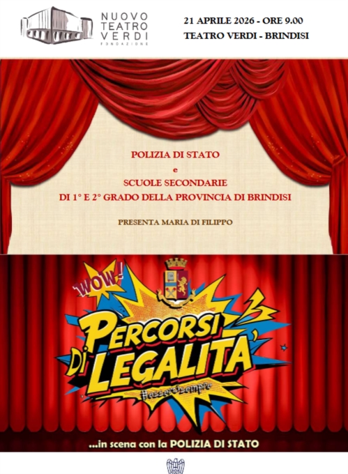 Il prossimo 21 aprile 2026, la Questura di Brindisi promuoverà la seconda edizione del progetto "Percorsi di legalità: in scena con la Polizia di Stato", iniziativa di rilievo nazionale che si svolgerà presso il Nuovo Teatro Verdi di Brindisi nel corso della mattinata. All'evento parteciperanno numerosi Istituti scolastici di Brindisi e provincia, nonché i rappresentanti delle più alte cariche istituzionali.