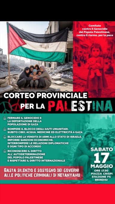 Il Comitato contro il Genocidio del Popolo Palestinese,contro il riarmo, per la pace, invita a partecipare tutte le persone sensibili ai temi proposti ad una riunione Martedì 13 Maggio alle ore 17,30 presso la casa di quartiere di Porta Mesagne;la riunione ha lo scopo di allargare la partecipazione al corteo di Sabato 17 Maggio er la Palestina ,contro il riarmo , per la pace con partenza alla ore 17,30 da Piazza Crispi (stazione FS) Brindisi.