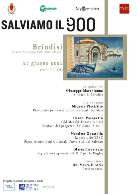 A presentare il 27 giugno le attività sin qui realizzate saranno Giuseppe Marchionna, Sindaco di Brindisi, Michele Piccirillo, Presidente della Confesercenti della provincia di Brindisi, Gianni Pasquetto, GM Meraki4Innovation S.r.l. ideatore del progetto “Salviamo il ‘900”, Massimo Guastella del Laboratorio TASC del Dipartimento Beni Culturali Università del Salento, l’architetto Maria Piccarreta, segretario regionale del MiC per la Puglia. Le conclusioni saranno affidate all’onorevole Mauro D’Attis.