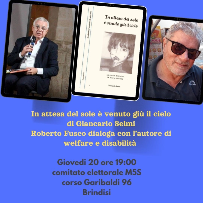 "In attesa del sole è venuto giù il cielo". È il titolo del libro che verrà presentato questa sera alle ore 19 presso la sede elettorale del candidato Roberto Fusco per il Movimento 5 Stelle al Consiglio Regionale della Puglia.Si tratta di un racconto su un bimbo speciale e straordinario. Su quanto la disabilità possa incidere nella vita delle persone e su quanto una famiglia di un disabile debba lottare per assicurare, al disabile stesso, la migliore qualità di vita possibile.