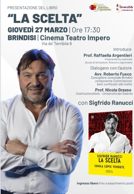 Giovedì 27 marzo alle 17:30 al Teatro Impero di Brindisi si terrà la presentazione del libro “La Scelta” di Sigfrido Ranucci, un appuntamento promosso dalla Scuola di formazione “Antonino Caponnetto” e da “Idrusa Libreria”. A introdurre l’incontro sarà la professoressa Raffaella Argentieri, vicepresidente nazionale della Scuola di formazione “Antonino Caponnetto”. Con l’autore dialogheranno l’avvocato Roberto Fusco, consigliere comunale di Brindisi e membro della Commissione beni confiscati alla mafia, e il professor Nicola Grasso, docente di Diritto costituzionale all’Università del Salento. Ingresso libero fino a esaurimento posti.Sigfrido Ranucci è un giornalista che ha fatto della ricerca della verità una missione quotidiana. A capo dell’équipe di Report, ogni giorno seleziona fonti, ricostruisce dinamiche, interroga testimoni per portare alla luce notizie che altrimenti rimarrebbero nell’ombra. “La Scelta”, pubblicato da Bompiani, è il racconto di un percorso professionale e personale segnato da inchieste che hanno inciso sulla realtà. Nel libro, Ranucci ripercorre il dietro le quinte di alcune delle sue indagini più significative e restituisce il senso di un mestiere che non si esaurisce nella cronaca, ma implica scelte determinanti, spesso irreversibili. Al centro della narrazione ci sono anche figure chiave della sua formazione, come il padre, atleta e finanziere dal forte carisma, e Roberto Morrione, fondatore di Rai News 24, che gli ha trasmesso il rigore e la determinazione necessari per portare fino in fondo ogni battaglia giornalistica.