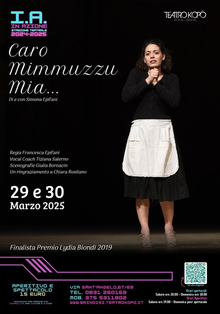 "Caro Mimmuzzu Mia..." in scena al Teatro Kopó di Brindisi il 29 e 30 marzo 2025Il Teatro Kopó di Brindisi ospita, il 29 e 30 marzo 2025, lo spettacolo "Caro Mimmuzzu Mia...", un'intensa narrazione che intreccia sogni, passioni e sacrifici sullo sfondo di un'Italia in fermento.