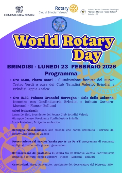 Si svolgerà questa sera a Brindisi il WORLD ROTARY DAY.Questo il programma :