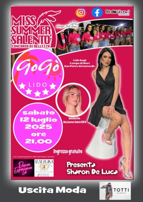 Il conto alla rovescia per la 2ª tappa di Miss Summer Salento 2025 è ufficialmente iniziato! Sabato 12 luglio, a partire dalle ore 21.00, la magia di questo prestigioso concorso tornerà a illuminare la splendida costa di Campo di Mare, presso l'incantevole Lido Gogò capitanato da Enzo Buttazzo. Dopo il grande successo della serata inaugurale dello scorso 1° maggio, che ha visto la partecipazione di tantissimi appassionati, il concorso ideato da Marcello Altomare e Niko Fiore promette ancora una volta una serata all'insegna di glamour, emozioni e spettacolo puro.Non si tratterà solo di una sfilata di bellezza, ma di un vero e proprio show dove arte e passione si fonderanno in un mix irresistibile. La serata sarà infatti arricchita dalla partecipazione della Scuola di ballo "Cuori Danzanti", guidata dalla maestra Simona De Giuseppe, che incanterà il pubblico con suggestive danze orientali, e da "Dance Experience Lab", diretta da Vincenzo D'Anna, con un travolgente spettacolo di Hip Hop Old School e New Style, insieme a danze caraibiche come la Salsa cubana e la Salsa portoricana. Un vero e proprio vortice di ritmo e movimento che accompagnerà l'evento con energia e fascino.