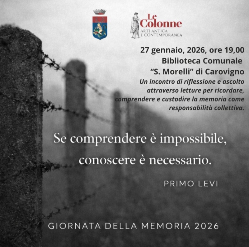 In occasione della Giornata della Memoria 2026, la Associazione Le Colonne, in collaborazione con il comune di Carovigno, promuove un incontro di riflessione e ascolto dal titolo “Se comprendere è impossibile, conoscere è necessario”, ispirato alle parole di Primo Levi.L’appuntamento è fissato per martedì 27 gennaio 2026, alle ore 19.00, presso la Biblioteca Comunale “S. Morelli” di Carovigno.