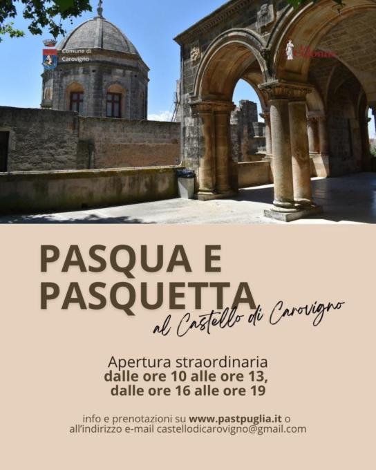 Aperture straordinarie per Pasqua e Pasquetta al Castello di CarovignoIn occasione delle festività pasquali, il Castello di Carovigno sarà aperto al pubblico anche domenica 5 aprile e lunedì 6 aprile, offrendo a cittadini e visitatori la possibilità di scoprire uno dei principali luoghi di interesse storico e culturale del territorio.