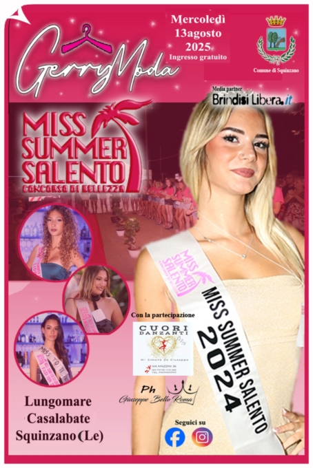 Miss Summer Salento 2025 incanta Casalabate: moda, bellezza e spettacolo il 13 agosto da Gerry ModaLa magia dell’estate salentina si riaccende con una delle tappe più attese del concorso Miss Summer Salento 2025, ideato e organizzato con passione e visione da Marcello Altomare e Niko Fiore. L’appuntamento è fissato per martedì 13 agosto alle ore 21.00 presso Gerry Moda, elegante punto di riferimento per lo stile sul lungomare di Casalabate, con il patrocinio del Comune di Squinzano.