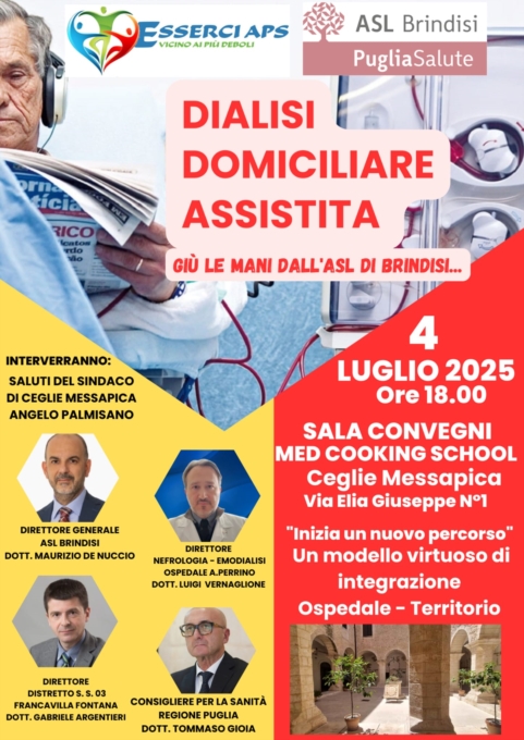 «La Dialisi Domiciliare Assistita» è il titolo del convegno che si terrà venerdì 4 luglio, alle 18, nella sala convegni della Med Cooking School di Ceglie Messapica. L’iniziativa è organizzata dal consigliere per la Sanità del presidente della Regione Puglia Emiliano, Tommaso Gioia, tra i promotori dell'introduzione del servizio di dialisi domiciliare. Gioia, attraverso il contatto diretto con pazienti, familiari e medici, ha potuto constatare l'importanza di questo servizio: «La dialisi domiciliare rappresenta un'opportunità imperdibile per allineare il nostro sistema sanitario agli obiettivi del Piano Regionale della Sanità, che mira alla deospedalizzazione – afferma-. Oggi, molti servizi sanitari vengono erogati direttamente presso il domicilio del paziente, come l'Assistenza Domiciliare Integrata (ADI) e l'Assistenza Domiciliare Oncologica (ADO) La dialisi a domicilio si inserisce perfettamente in questo contesto». I vantaggi della dialisi domiciliare per i pazienti con insufficienza renale cronica sono numerosi quali la maggiore flessibilità nella gestione del trattamento, consentendo ai pazienti di organizzare le proprie terapie secondo le necessità individuali senza dover recarsi in ospedale; un miglioramento della qualità della vita per pazienti e familiari; la riduzione dei rischi di infezioni; il maggiore controllo della pressione arteriosa; la possibilità di curarsi in un ambiente familiare e rassicurante.