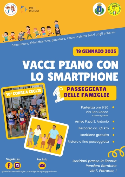 Il Patto digitale "Il telefono senza fili", in occasione della 10a edizione della gara podistica "Corri a Ceglie", organizzata dall'Associazione Atletica Ceglie Messapica con il Patrocinio del Comune di Ceglie Messapica, organizza la 1a Passeggiata delle famiglie "Vacci piano con lo smartphone" con l'intento di sensibilizzare le famiglie a un utilizzo consapevole e informato dei dispositivi digitali in famiglia, soprattutto da parte dei bambini e dei preadolescenti.L'iscrizione alla Passeggiata delle famiglie è gratuita e può essere effettuata presso la libreria Pensiero Bambino in via Petrarca, 1 a Ceglie M.