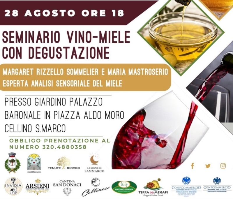 In particolare, alle ore 18.00, ci sarà un Seminario vino-miele con degustazione, alla presenza della sommelier Margaret Rizzello e dell'esperta di analisi sensoriale del miele Maria Mastroserio.