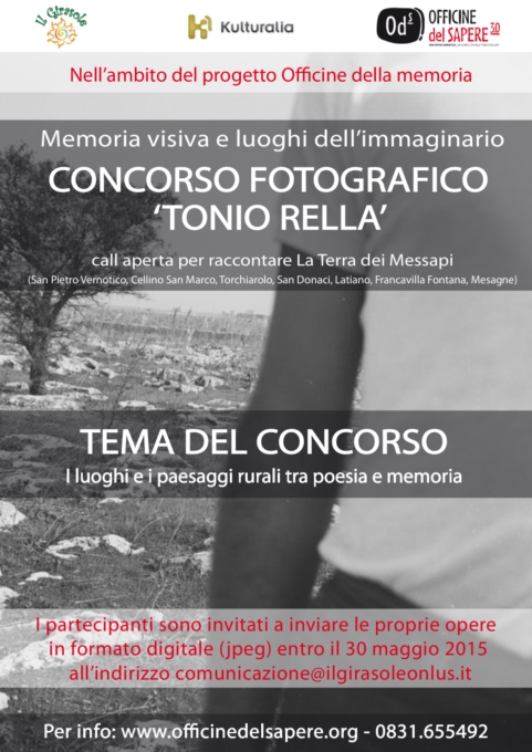 Al via le iscrizioni al concorso fotografico “Tonio Rella” – Memoria visiva e luoghi dell’immaginario, una call aperta organizzata dalla cooperativa sociale “Il Girasole onlus” rivolta a tutti coloro che vogliano raccontare fotograficamente il territorio brindisino conosciuto come la Terra dei Messapi che comprende San Pietro Vernotico, Cellino San Marco, Torchiarolo, San Donaci, Latiano, Francavilla Fontana e Mesagne. Il tema di questa prima edizione del concorso sono i luoghi e i paesaggi rurali, tra poesia e memoria. I partecipanti sono invitati a inviare le proprie opere in formato digitale (jpeg) entro il 30 maggio 2015 all’indirizzo comunicazione@ilgirasoleonlus.it.