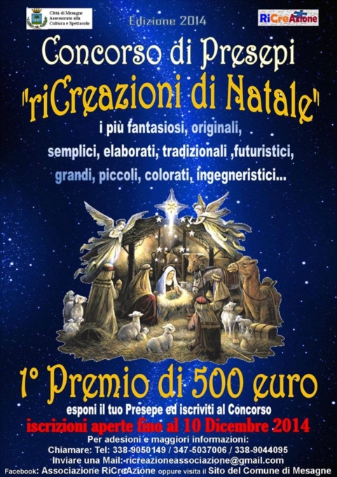 Attraverso la partecipazione a un concorso a premi, l’Associazione ‘RiCreAzione’ rilancia la tradizione natalizia mesagnese di creare ed esporre presepi di manifattura artigianale e non. Sarà inaugurata proprio il 25 dicembre, infatti, presso Piazza Commestibili, nel suggestivo scenario del centro storico di Mesagne, l’esposizione dei presepi partecipanti al concorso, ai quali saranno affiancate anche le opere di coloro che intendono semplicemente esporre la propria creazione fuori concorso, in un coinvolgimento totale della cittadinanza nelle sue diverse forme di rappresentanza.