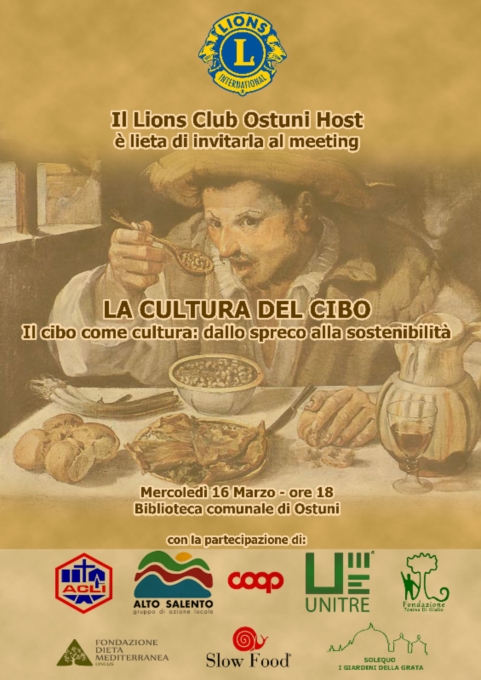 Lo spreco alimentare passa anche attraverso il frigorifero di casa nostra. Circa 4 miliardi di euro è il valore dei cibi che buttiamo nei rifiuti dopo averli comperati, il 30% del totale degli sprechi alimentari, che sommano in tutto a 12,6 miliardi di euro all’anno. Quindi comperiamo troppo e sprechiamo cibo. Potremmo chiamarlo «spreco nascosto», perché non ce ne accorgiamo, ma è stato verificato che accade nelle famiglie italiane, come nel resto del mondo: si buttano le foglie più esterne delle verdure perché sono brutte, buttiamo il cibo scaduto, buttiamo cibo che non ci piace più.Il Lions Club Ostuni Host unitamente a Coop 3.0 di Brindisi, Slow Food, Cooperativa Solequo, ACLI di Brindisi, Fondazione Dieta Mediterranea, Fondazione Tonino di Giulio, GAL Alto Salento e Unitre, organizzano mercoledì 16 marzo, alle ore 18, presso la Biblioteca Comunale di OSTUNI, una tavola rotonda sulla “Cultura del Cibo: il cibo come cultura dallo spreco alla sostenibilità”.