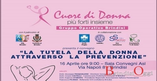 "La tutela della donna attraverso la prevenzione". E' questo il tema di un convegno che si terrà il prossimo 16 aprile a Brindisi, a partire dalle ore 09.00, nella sala convegni della Asl in Via Napoli su iniziativa dell'associazione "Cuore di donna" impegnata nella diffusione della cultura della prevenzione e della diagnosi precoce dei tumori femminili con particolare attenzione per quello del seno.Il convegno gode del patrocinio del Comune di Brindisi e della Asl di Brindisi e si avvale della collaborazione dell'Associazione Fisioterapisti Puglia, dell'Associazione Mogli Medici di Brindisi, di Sos Linfedema e della Fondazione "Tonino Di Giulio". "Cuore di donna" è un'associazione di donne per le donne nata dall'idea di un gruppo di pazienti oncologiche che hanno sentito forte il bisogno di condividere le proprie esperienze di malattia, ma anche di guarigione.