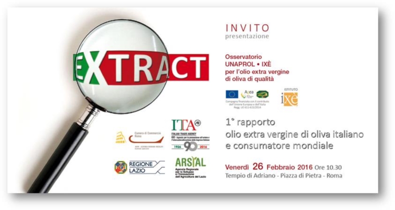 Si tratta del primo rapporto: OLIO EXTRA VERGINE DI OLIVA ITALIANO E CONSUMATORE MONDIALE. L'evento di Unaprol è realizzato con la collaborazione dell'Istituto Ixè. Il rapporto sarà occasione per fare il punto sulla situazione del comparto e per conoscere la percezione che del consumatore mondiale nei confronti dell'olio extra vergine di oliva italiano. Per l'occasione sarà presentata una selezione dei migliori oli di tutte le regioni d'Italia che esporranno, al pubblico, nel tempio di Adriano le loro eccellenze olearie Venerdì 26 e Sabato 27 Febbraio.