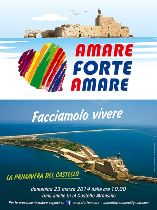 Nella mattinata di ieri, presso palazzo Granafei-Nervegna di Brindisi, si è svolta conferenza stampa del gruppo "Amare Forte Amare", gruppo composto da 21 Associazioni che si sono già impegnate e si impegnano al recupero, alla valorizzazione e fruizione del Castello Alfonsino-Forte a mare di Brindisi.Nel corso dell'incontro è stata dettagliatamente illustrata l'iniziativa che si svolgerà la mattina del 23 marzo a partire dalle ore 10:00 che avrà per titolo Facciamolo vivere- la Primavera del Castello, iniziativa che chiederà ai brindisini di "abbracciare" il castello, l'opera a corno, l'intera area su cui insistono questi straordinari beni architettonici, culturali ed ambientali nel contempo di favorire e accelerare il processo di acquisizione del Bene da parte dell’Amministrazione Comunale di Brindisi.