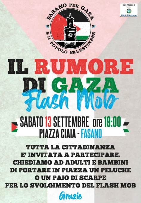 Il Comitato Cittadino FASANO per GAZA e IL POPOLO PALESTINESE invita tutta la cittadinanza, adulti, giovani e bambini, al Flash Mob che si terrà in Piazza Ciaia sabato 13 settembre a partire dalle ore 19:00.Inoltre, l'invito è che si portino in piazza un paio di scarpe, peluche e libri perché ognuno possa contribuire alla riuscita della manifestazione perché il Flash Mob possa essere un momento unico di partecipazione e riflessione su quanto di terribile sta accadendo nella Striscia di Gaza ad opera dell'esercito israeliano sotto il comando del governo del primo ministro Benjamin Netanyahu.